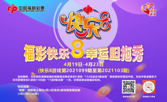 为回馈广大彩民的支持和厚爱,湖南福彩将于4月19日至4月23日,开展为期5天的“福彩快乐8,幸运胆拖秀”营销活动。