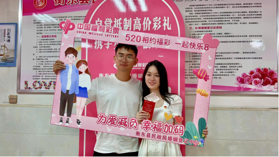 5月20日,衡阳县福彩联合衡阳县婚姻登记中心开展“公益福彩,爱满5·20”福彩宣传活动,让新人们感受甜蜜氛围和福彩公益温暖。