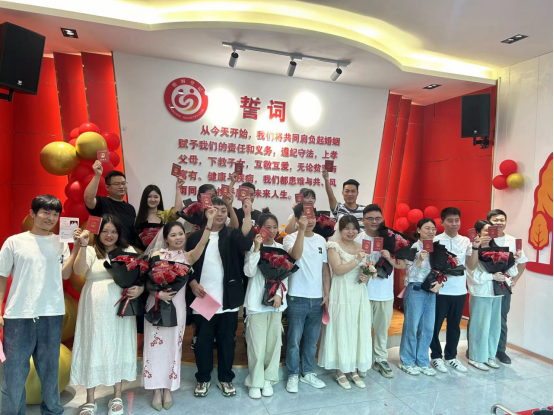 现场,衡南福彩准备绚丽的刮刮乐彩票花束,设置浪漫的网红打卡“表白墙”,为现场领证的20对新人送上了精美的福彩刮刮乐花束,表达对他们的美好祝福,在集体证婚和颁证环节后,新人们纷纷拿着结婚证高兴地合影,定格甜蜜瞬间。