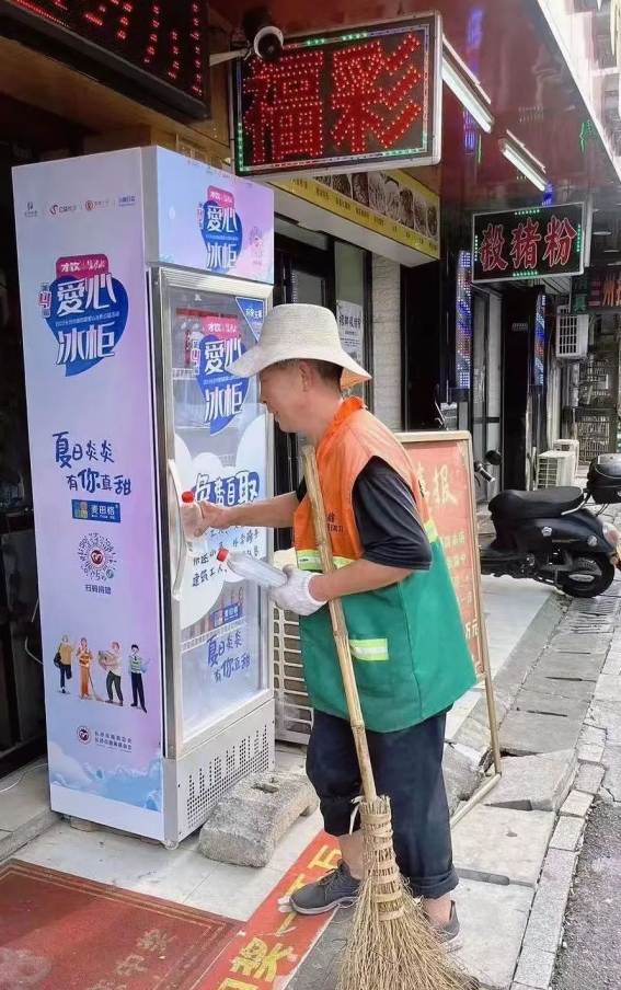 在长沙市岳麓区王家湾洋海塘小区福彩43014947福潮店站点,一个显眼的爱心冰柜摆放在门口,冰柜内放置着由爱心企业和市民捐助的冷饮,供交通警察、城管队员、环卫工人、外卖骑手、快递小哥等户外工作者免费自取。这是长沙福彩践行公益,积极参与长沙市第四届爱心冰柜公益活动的一个缩影。