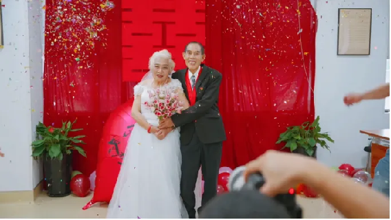 另外一组志愿者则是帮助85岁的喻嗲嗲和79岁的傅娭毑拍婚纱照。他们是住在福利中心的一对夫妻,今年刚好结婚60周年。在物质稀缺的年代,夫妻俩当时没有条件拍摄婚纱照。他们想在钻石婚这一年,拍一张婚纱照,弥补当年的遗憾。