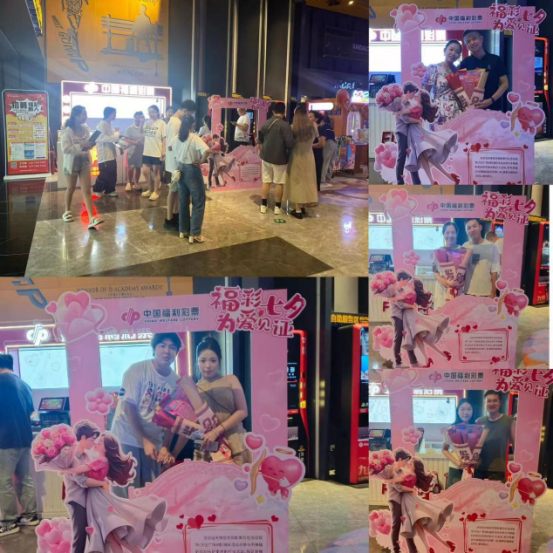 在衡阳蒸湘区万达广场,设计精美的七夕打卡墙也吸引了众多新人拍照打卡,定格美好瞬间。当天情侣们凭借观影票,即可获赠20元面值即开票一张,感受福彩带来的满满祝福。