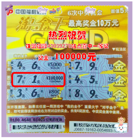 3月13日下午,株洲市福彩中心迎来了一位“幸运星”,他一进门就兴奋地喊:“我要兑大奖!”经工作人员确认,这位来自株洲市天元区武警新村的43039278投注站的幸运彩民刮中了刮刮乐“淘金王”一等奖,奖金:10万元。