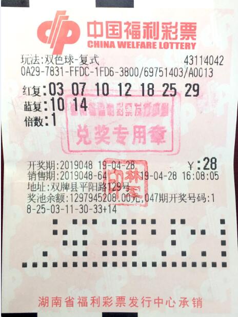 4月28日,福彩双色球第2019048期开奖,开出红球号码:03、07、10、12、18、29,开出蓝球:10。当期全国中出一等奖8注,单注奖金725万余元。我省永州彩民喜中1注头奖,中奖福地为永州市双牌县43114042号福彩投注站。