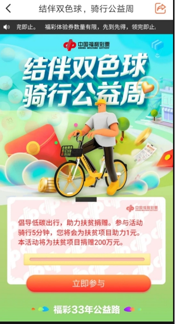 7月28日起至8月5日,活动的第二部分开始啦!在美团APP扫码骑车,即可参加“结伴双色球,骑行公益周”活动。通过绿色出行方式来助力扶贫,同时还可以兑换不同金额的福彩体验券。此次活动将筹集公益捐助金200万元,活动结束后,以活动参与者集体的名义捐给指定的扶贫项目。既能绿色出行,又能做公益,还可以领体验券,一举三得!还不快来和小编一起看看如何参与!