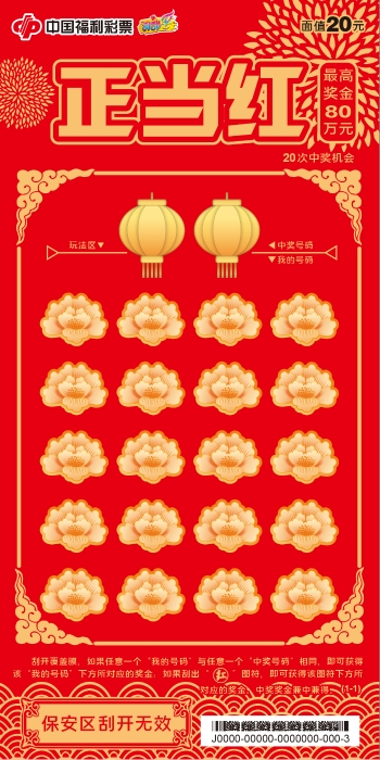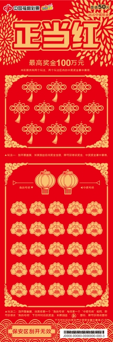 票面以红色及金色为主色调,刮开区采用了象征富贵吉祥的牡丹花和富有质感的灯笼、云纹等元素,代表着好运将至。整体票面寓意积极向上,更代表了“中国正当红”的含义。而它的玩法也简单易上手。