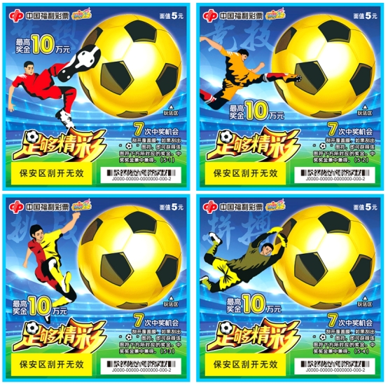 我省福彩刮刮乐又上新玩法,10月30日,一款以体育运动为题材的彩票“足够精彩”在我省上市,该款彩票是由中福彩中心推出的以足球运动为元素设计的一套五联彩票。彩票面值5元,10个奖级,共有7次中奖机会,最高奖金10万元。票面以聚光灯下的绿茵场为背景,金色的足球作为玩法区,5个英姿飒爽的足球运动员分别代表足球运动中的梦想、竞技、挑战、拼搏和激情。画面生动有趣,玩法简单,其玩法规则为:刮开覆盖膜,如果刮出“足球”图符,即可获得该图符下方所对应的奖金。中奖奖金兼中兼得。(杨强威)