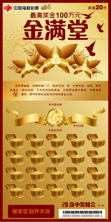 “金满堂”面值20元,10个奖级,中奖面34.49%。最高奖金100万元。该款彩票采用简单的“对数字”玩法,简单易懂,极易上手。刮开覆盖膜,如果任意一个“我的号码”与“中奖号码”相同,即可获得该“我的号码”下方所对应的奖金,中奖奖金兼中兼得。如果刮出
