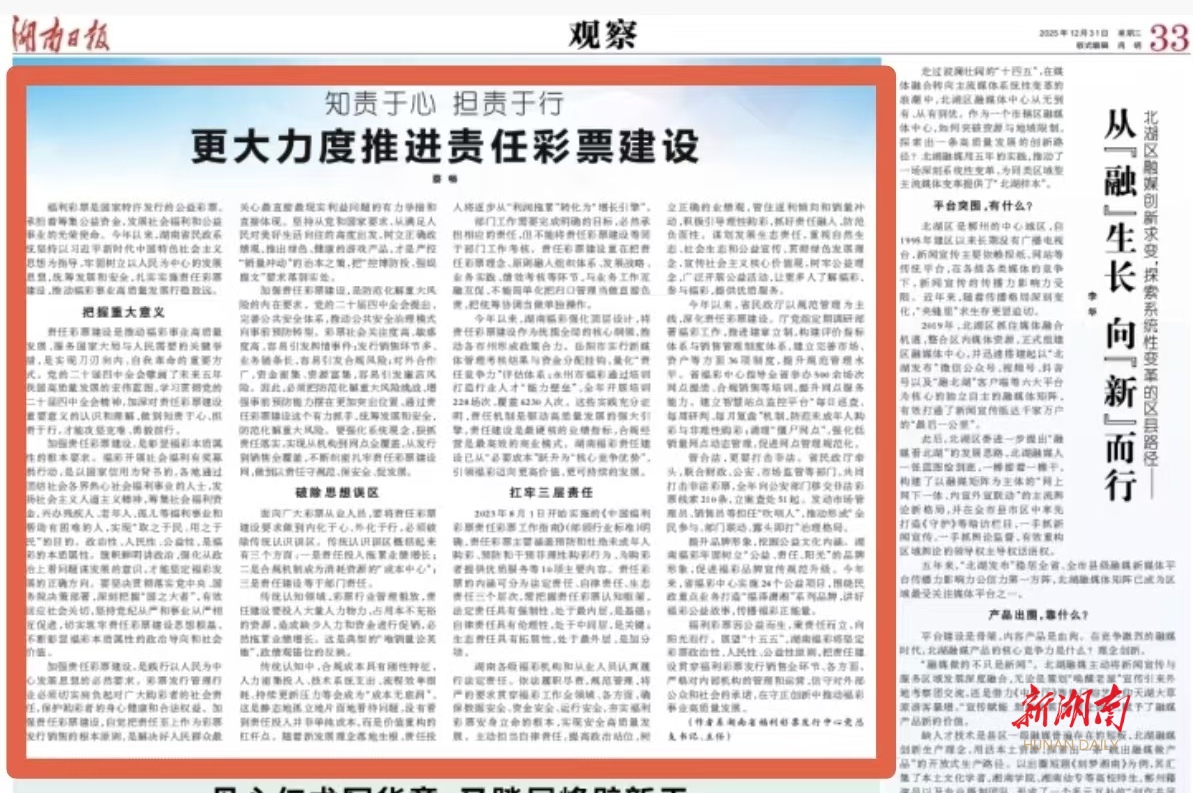 福利彩票因公益而生,秉责任而立,向阳光而行。展望十五五,湖南福彩将坚定彩票政治性、人民性、公益性原则,把责任建设贯穿福利彩票发行销售全环节、各方面,严格对内部机构的管理和运营,信守对外部公众和社会的承诺,在守正创新中推动福彩事业高质量发展。