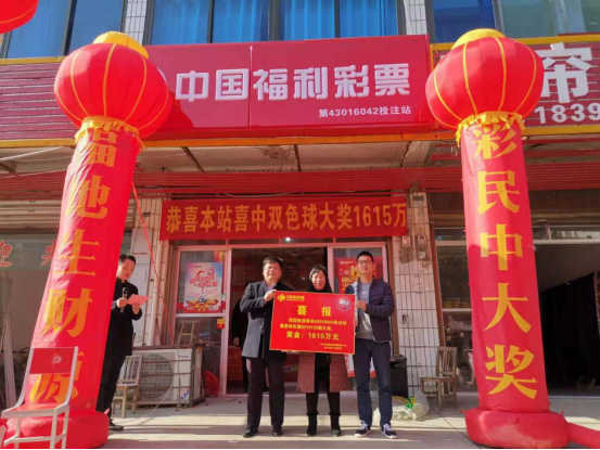 为庆祝宁乡福彩今年以来最高大奖的诞生,宁乡市福利彩票事务中心在此举行隆重的庆祝活动,庆祝该站点幸运彩民在“双色球12亿大派奖”期间喜中福彩双色球1615万元大奖。庆祝活动上,宁乡市民政局副局长、福彩事务中心主任一同为43016042投注站颁发了“千万大奖”喜牌。43016042投注站业主表示要加倍努力做好福彩销售工作,为国家公益事业多做贡献。