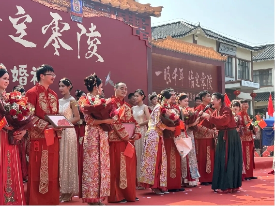 9月29日上午,湖南省首届古装集体婚礼“一眼千年· 情定零陵 ·福彩永州”活动在零陵区东山景区举行,27对新人体验了唐制婚礼流程,在新中式特色下“一拜盛世华年,二拜高堂至今,三拜伉俪同心”,许下彼此“相守一生,白头偕老”的承诺。