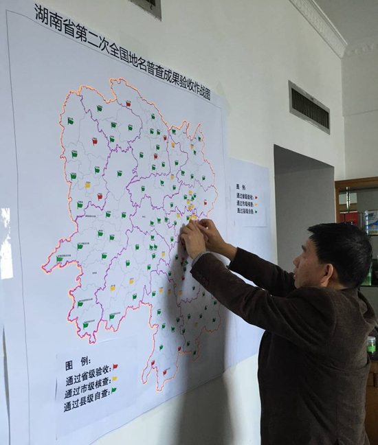 4月28日,阳光明媚,省地名普查办气氛热烈,士气高昂,办公室墙上高挂作战图,一副临战状态。作战图以县级行政区域为单元,用红黄绿三色旗帜标示进展:红旗标志已通过省级验收,黄旗标志已通过市级核查,绿旗标志已通过县级自查。有了这张图,全省地名普查验收进展情况一目了然。根据这张图,省普查办将科学调配力量,组成验收组分赴各地进行验收。作战图将每天更新,并将每隔10天,向全省各级地名普查领导小组及其办公室通报一次进度。省地名普查办主任、省民政厅副厅长邓磊亲自给通过省级验收的天元区、浏阳市、芦淞区、醴陵市、石鼓区、衡南县、衡山县、衡东县、武陵区、安乡县、石门县、蓝山县、江永县、江华县、永顺县、泸溪县等县市区插上鲜艳的红旗。另有炎陵县等通过了市级核查市县区,插上了黄旗。