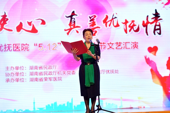 在第106个“5.12”国际护士节到来之际,5月12日,湖南省民政厅在长沙举行了以“美丽天使心,真善优抚情”为主题的全省优抚医院文艺汇演。厅领导唐白玉、陈慈英、孙中喜、曹壮波,省直工委委员余卫星和省财政厅社保处负责同志出席。省民政厅机关干部、全省各优抚医院负责人、在省荣军医院集中供养和短期疗养的荣誉军人参加。