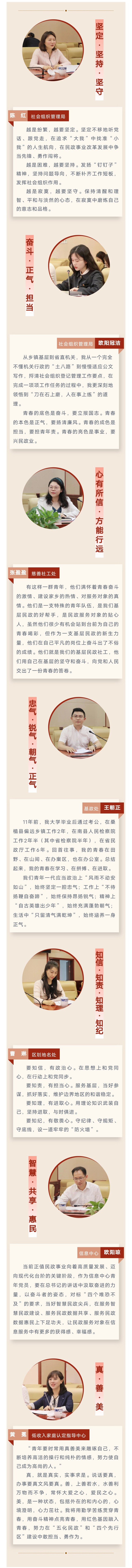 座谈会上,省民政厅7位青年代表,结合本职工作、各自经历分享了不一样的青春故事,曹忠平为之点赞。他说,青年干部作为党和国家事业发展的生力军,使命光荣、责任重大,希望民政青年努力成长为有理想、敢担当、能吃苦、肯奋斗、愿奉献的新时代好青年,在履行基本民生保障、基层社会治理、基本社会服务等职责中展现“为民爱民”的青年担当。