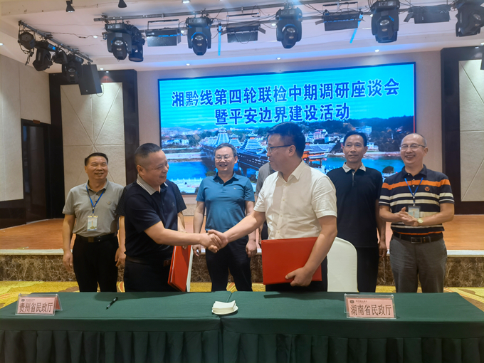 6月21日,湘黔线第四轮联检中期调研座谈会暨平安边界建设活动在新晃县举行,湖南省民政厅党组成员、副厅长游劲民和贵州省民政厅党组成员、副厅长邓湘贵出席活动并讲话。湖南、贵州两省民政厅区划地名工作人员和湘黔线毗邻市(州)、县(市、区)民政部门相关负责同志,区划地名科(股)长参加活动。
