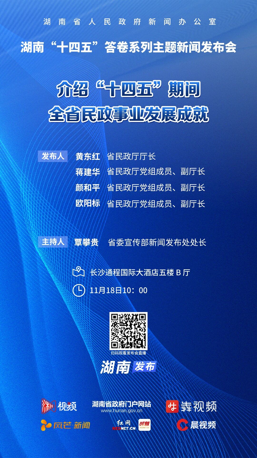 11月18日上午10点,湖南省人民政府新闻办公室将举行湖南“十四五”答卷系列主题新闻发布会,介绍“十四五”期间全省民政事业发展成就,欢迎大家关注。
