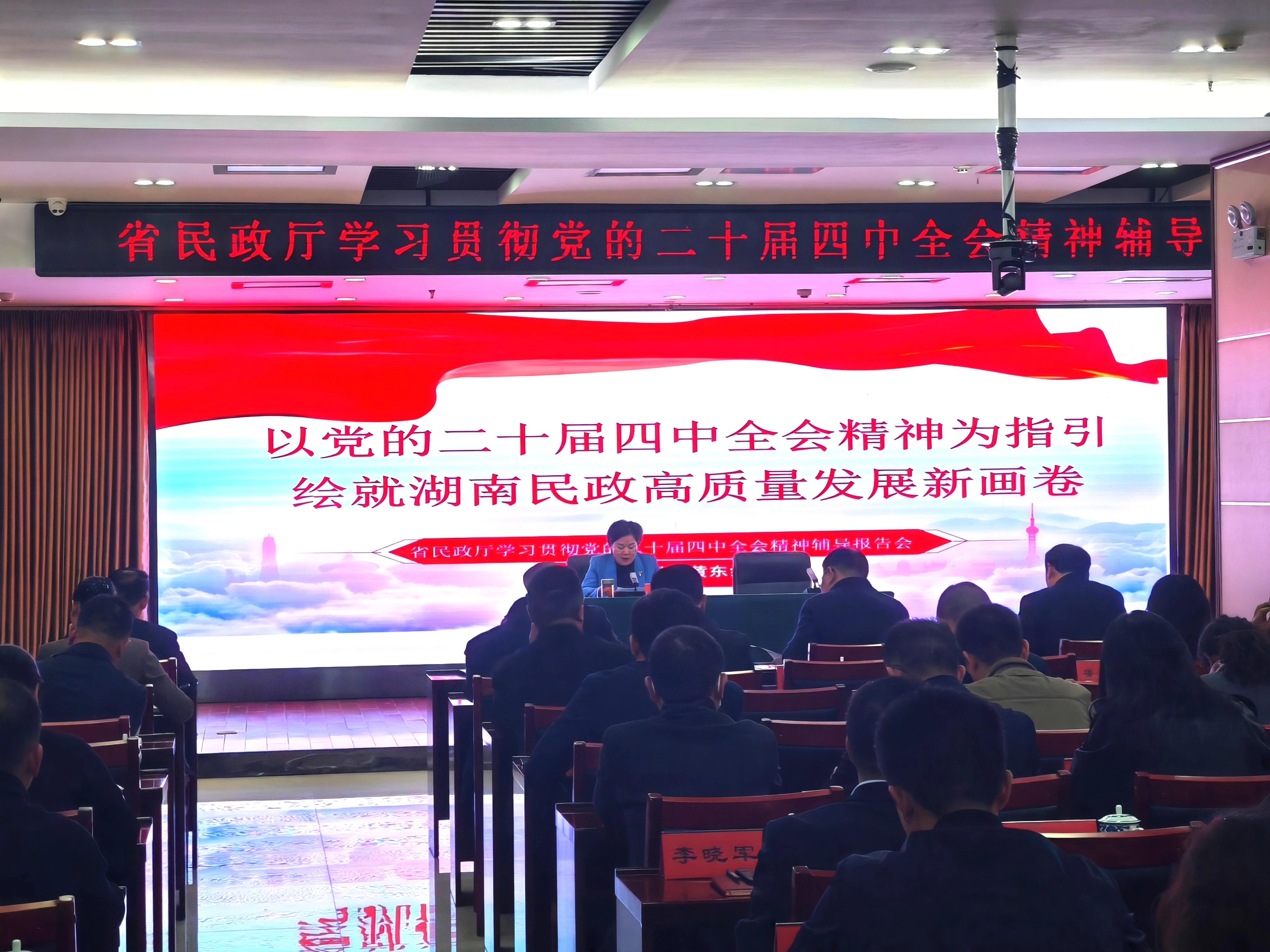 11月14日,湖南省民政厅召开学习贯彻党的二十届四中全会精神专题辅导报告会。黄东红厅长以“以党的二十届四中全会精神为指引,绘就湖南民政高质量发展新画卷”为题进行了全会精神宣讲。在家厅领导、全厅干部职工和直属单位中层以上干部参加会议。