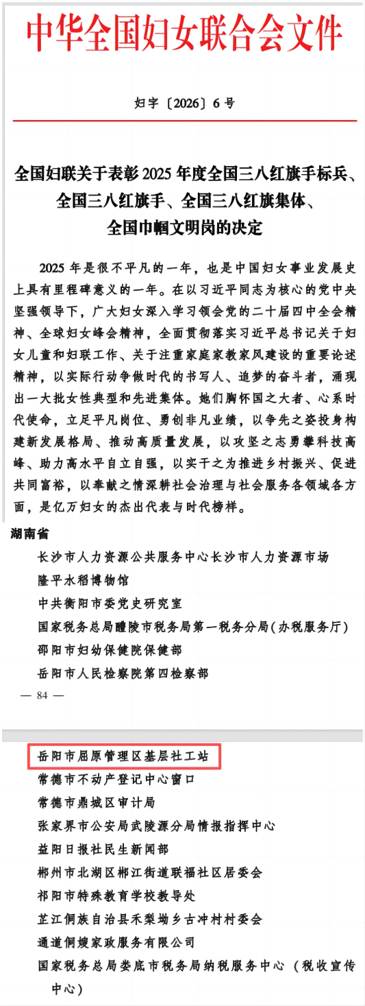 为表彰先进、树立榜样,充分发挥先进典型和模范人物示范作用,全国妇联决定,表彰2025年度全国三八红旗手、全国三八红旗集体、全国巾帼文明岗。其中,我省岳阳市屈原管理区基层社工站被授予全国巾帼文明岗称号。