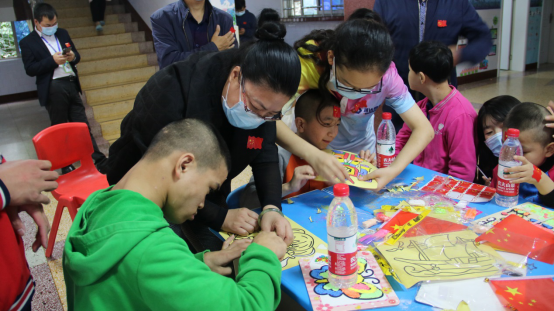 志愿者们情不自禁地抱起了这群特殊的孩子们,让他们坐在自己的前面,用大手牵动小手,制作出一幅幅活泼可爱的手工贴画。“感恩的心,感谢命运,花开花落,我一样会珍惜…”熟悉动人的旋律,伴着手语老师的指导,孤残儿童用稚嫩的双手,舞动出一段情感真挚的手势舞。在大家热情的鼓舞下,伴随着欢快轻松的音乐,孩子们还继续表演了三只小猫舞蹈。最后,大家一起唱起《我和我的祖国》,表达了孩子们对祖国对美好生活的向往和祝福。