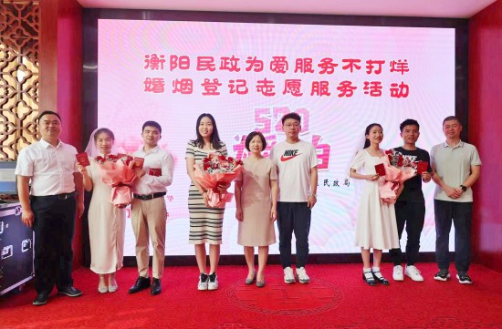 因谐音“我爱你”,能够在5月20日结为连理是一件幸福浪漫的事情。今年“5·20”恰逢周六,为满足广大新人的在具有美好寓意的日子领证结婚的需求,衡阳民政在全市十二个婚姻登记机关开展了“为爱服务不打烊”婚姻登记志愿服务活动。