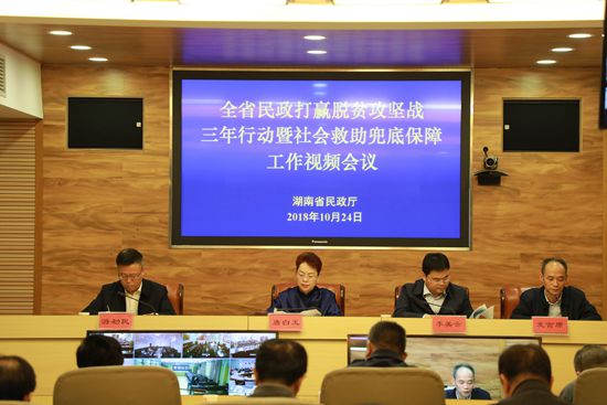 10月24日下午,全省民政打赢脱贫攻坚战三年行动暨社会救助兜底保障工作视频会议召开,落实《湖南省民政厅关于打赢脱贫攻坚战三年行动的实施方案》和近期省民政厅、省教育厅、省财政厅等8部门联合出台的《关于在脱贫攻坚三年行动中切实做好社会救助兜底保障工作的实施方案》精神,进一步做到低保应保尽保、应退尽退,加强政策制度衔接,低保对象和建档立卡对象符合条件互相纳入,加强社会救助制度与教育扶贫、健康扶贫、危房改造政策衔接。省民政厅党组书记、厅长唐白玉,省扶贫办党组成员、副主任李美云出席并讲话。省财政厅、省残联有关负责同志就协同推进社会救助兜底保障工作作了发言。