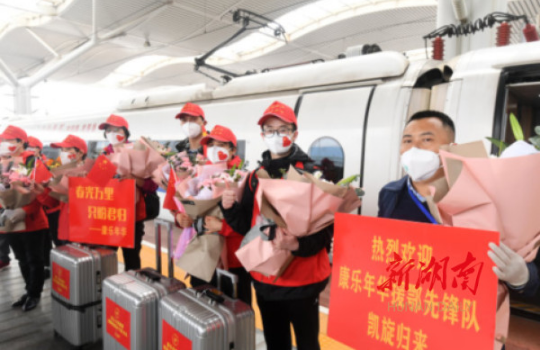 “欢迎最美民政人回家!”“致敬新时代最可爱的人!”......3月24日中午,湖南养老服务支援湖北先锋队34名队员乘坐高铁G649列车平安回到长沙。当高铁列车缓缓停靠长沙南站站台,车门打开,队员们面带笑容,手持五星红旗和“湖南养老服务支援湖北先锋队”队旗,精神抖擞地步出车门,迎接的人员立即拉起横幅向这些“逆行勇士”致敬!