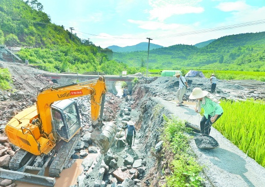 上图:8月2日,泸溪县武溪镇红岩村,村民冒着酷暑加固河堤。该村曾是深度贫困村,近年来,在当地政府和省民政厅驻村帮扶下,陆续完善了基础设施建设,村容村貌得到了明显改善。
