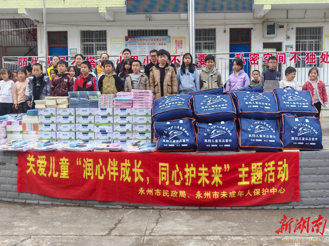 今天下午,由永州市民政局、永州市未成年人保护中心主办的关爱儿童“润心伴成长、同心护未来”主题活动,走进江永县松柏瑶族乡中心小学,为在该校就读的西栎尾村40名留守儿童送去空调被、书包、牛奶、文具等每人价值600元的“爱心礼包”。