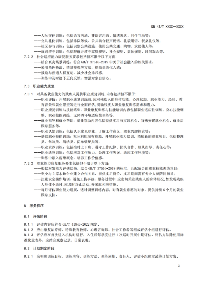 根据湖南省地方标准制修订计划,省民政厅组织起草了《智力障碍对象综合技能康复服务规范》地方标准,现面向湖南省内公开征求意见。如有意见建议,请填写《意见反馈表》,于2025年11月13日前将书面意见以电子邮件或信件(来信请标明“标准意见反馈”)等形式反馈我们。