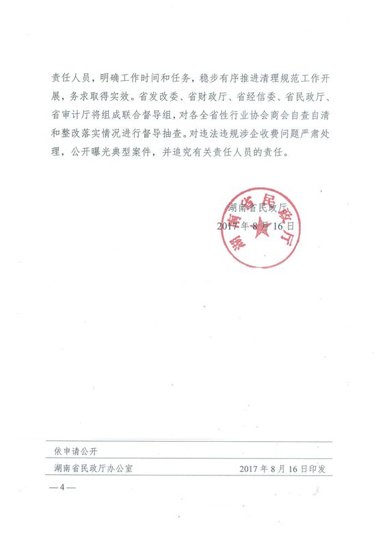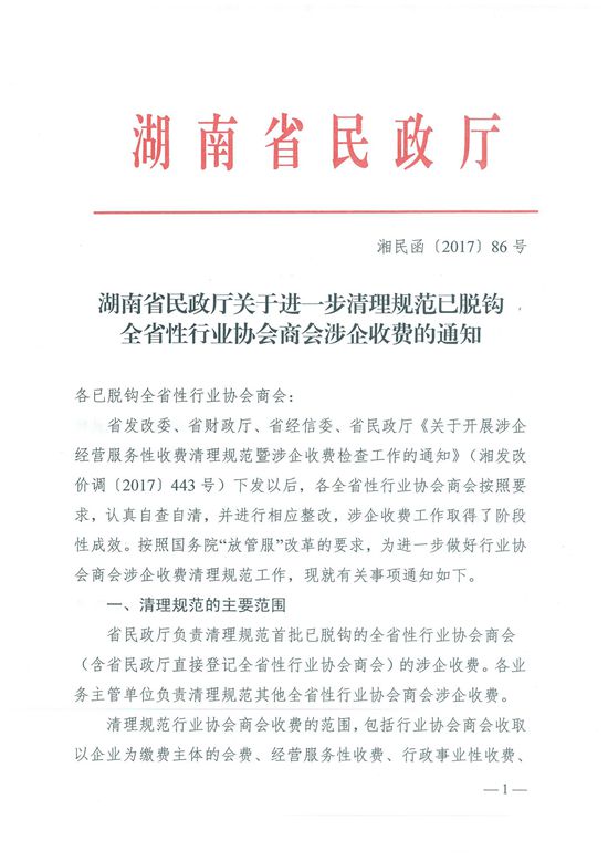 湖南省民政厅关于进一步清理规范已脱钩全省性行业协会商会涉企收费的通知