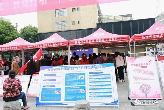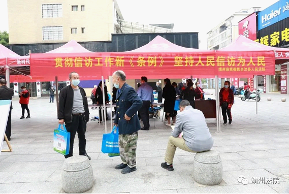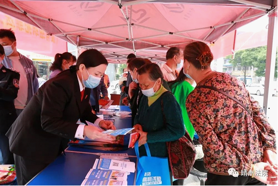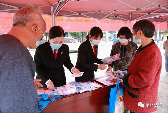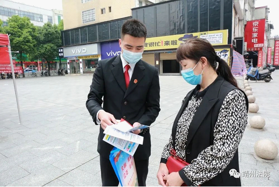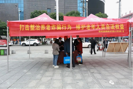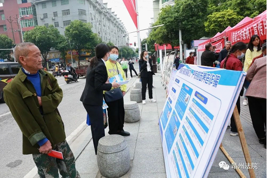 5月18日上午,靖州县人民法院组织干警来到靖天国际广场就信访工作条例、防范养老诈骗及反有组织犯罪法等相关法规进行宣传解读。