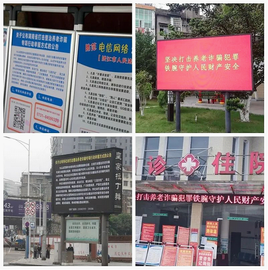 “3”即3个平台同步推进。充分发挥新闻媒体作用,在怀化日报、怀化新闻网、怀化电视台等主流媒体开辟“打击整治养老诈骗”专栏专题,建立市、县、乡三级专项行动媒体宣传矩阵,发布打击整治养老诈骗行为举报方式的公告,加大涉养老诈骗典型案件曝光力度。充分发挥微信、短信平台作用,依托全市11.26万个微网格微信服务群,持续推送打击整治养老诈骗宣传知识,积极借助移动、电信、联通短信平台,“点对点”向老年人发布风险提示和预警信息。充分发挥公共实体平台作用,全市各级各单位利用公示栏、橱窗、电子屏,滚动播放或悬挂宣传标语,在市场、公园、广场等场所的大型LED屏幕,出租车车顶广告灯、公交车电视等各种载体开展广泛宣传。