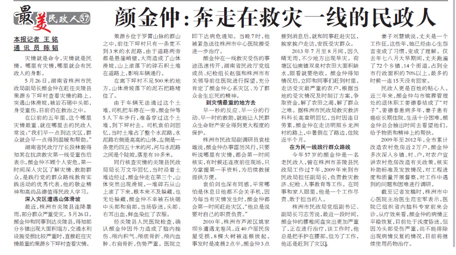 今年57 岁的颜金仲是一名老民政人,曾在株洲市茶陵县民政局工作过7 年,2009 年来到市民政局担任副局长,负责救灾救济、纪检、人事教育等工作。在同事和家人眼里,他是一个工作尽责、敢于担当的人。