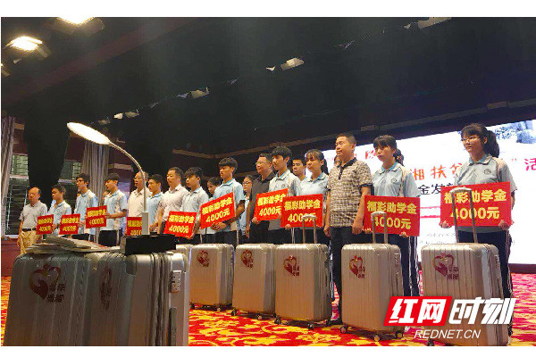 8月23日,2018“福泽潇湘 扶贫助学”福彩助学金发放仪式现场,湖南民政福彩中心为受助学生代表颁发4000元助学金。