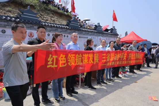 图为:湘桂黔三省(区)及市、县民政部门工作人员在三省坡政策宣传现场