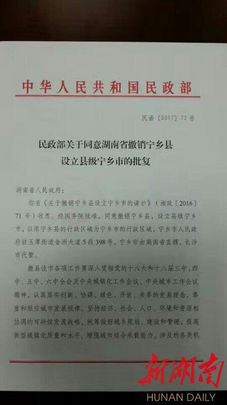 新湖南客户端4月12日讯(记者 李曼斯)今天,记者获悉,经国务院批准,同意撤销宁乡县,设立县级宁乡市,以原宁乡县的行政区域为宁乡市的行政区域。宁乡市人民政府仍驻玉潭街道金洲大道5段398号。宁乡市由湖南省直辖,长沙市代管。