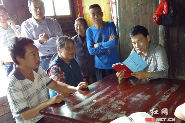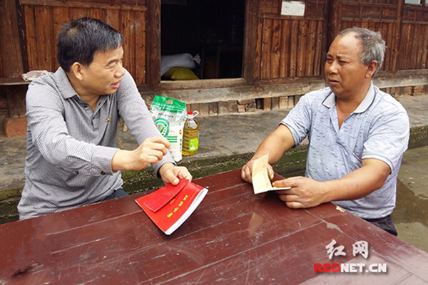 6月16日上午,雨后初晴,贫困户李松荣一家正吃早饭。湖南省民政厅党组成员、副厅长邓磊一行带着食用油和大米,沿着泥泞小路径直走向李家,熹微的晨光洒在他们“共产党员”的红色胸牌上。