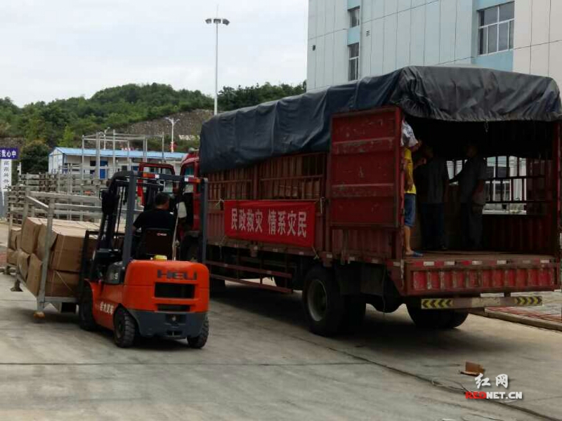 7月4日,一台叉车正在中央救灾物资长沙储备库作业,向大货车搬装运往重灾区的救灾物资。祝林书 摄